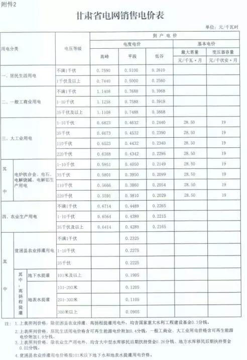 2:甘肅省電網(wǎng)銷售電價(jià)表
