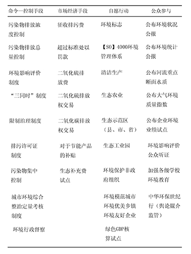 關于我國環境治理的實踐過程,張坤民等(2007) 建立了包栝命令—控制手段、經濟刺激手段和公眾參與或稱自愿手段等多樣化的環境政策工具矩陣。見表2.1