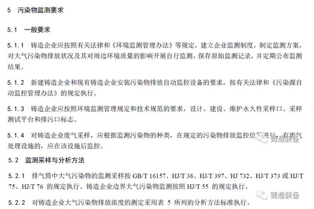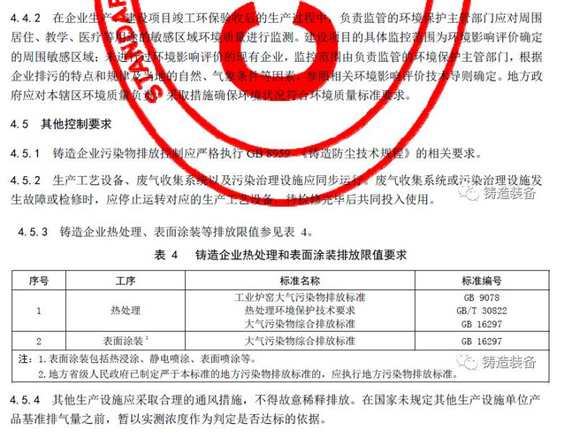 現(xiàn)摘錄T/CFA030802-2—2017中“4排放控制要求”、“5污染物監(jiān)測要求”、“6實(shí)施與監(jiān)督”部分。前三部分“1范圍、2規(guī)范性引用文件、3術(shù)語與定義”請自行登錄中國鑄造協(xié)會網(wǎng)站查閱。