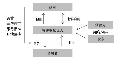 特許經(jīng)營權允許社會資本運營商(受讓人)在指定區(qū)域內(nèi)負資全商提供公共服務,包括系統(tǒng)的運營、維護,征收費用,管理,建設和修復等,同時,運營商負責所有資本投資。盡管社會資本運營商負赍提供資產(chǎn),該資產(chǎn)即使在特許期內(nèi)也屬于政府所有。政府負確定實施標準,并確保受讓人能達到標準。從本質 上講,待許經(jīng)營模式將政府的角色從服務提供者轉變?yōu)榉諆r格和質量的規(guī)范者。