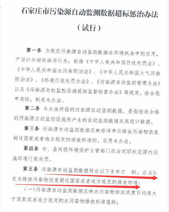 近日河北石家莊市環(huán)保局印發(fā)《石家莊市污染源自動監(jiān)測數(shù)據(jù)超標懲治辦法(試行)》(以下簡稱“辦法”)。辦法明確,企業(yè)污染源自動監(jiān)測數(shù)據(jù)出現(xiàn)超標將被處罰,超標4次及以上,將停產(chǎn)整治。辦法自11月1日起施行。