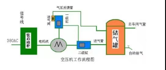 如空壓機(jī)工作流程圖所示:??? 螺桿壓縮機(jī)的工作原理可分為進(jìn)氣,壓縮和排氣三個(gè)過程。隨著轉(zhuǎn)子旋轉(zhuǎn),每對(duì)相互嚙合的齒相繼完成相同的工作循環(huán)。?