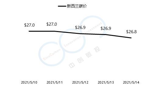 2021年5月10日至5月14日,新西蘭碳價由27.0美元/噸一路跌至26.8美元/噸。