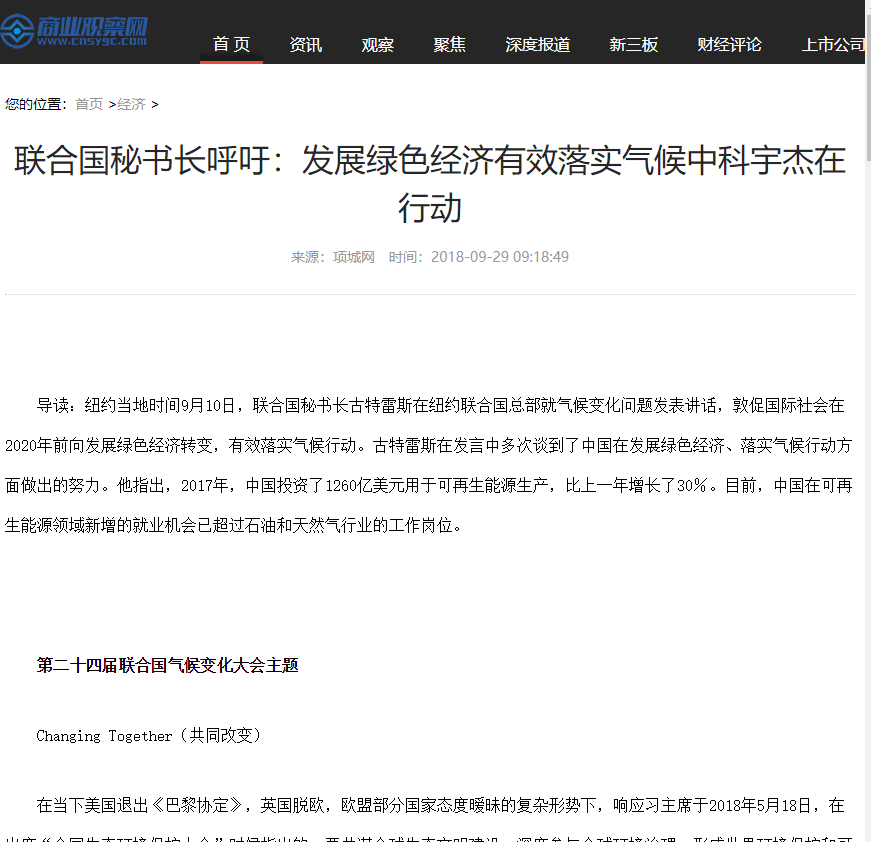 媒體爭相報道:發展綠色經濟有效落實氣候中科宇杰在行動