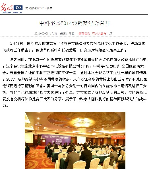 與之同時,在北京一個同樣與節能減排工作緊密相關的會議也在如火如荼地進行當中。這個會議就是北京中科宇杰節電設備有限公司(下稱:中科宇 杰)2014年全國經銷商大會。來自全國各地的中科宇杰經銷商匯聚一堂,通過本次會議總結了過往一年的項目情況。2013年各地經銷商都有不同程度的收 獲,來自浙江金華的黃博士與山西介休的孫總代表經銷商進行了精彩的發言。黃博士與孫總分別針對目前國內的節能減排市場情況進行了分析,并把自己的成功經驗 與大家進行了分享,大大鼓舞了各地經銷商的士氣。與經銷商代表發言交相輝映的是員工代表的分享,展示了中科宇杰團隊良好的精神面貌與強大的戰斗力。