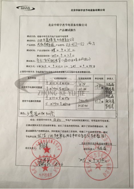 經過山西永鑫管理人員的嚴格審核,中科宇杰智能風機節電系統的節能效率達到了56.7%,遠遠超過了企業的預期,山西永鑫的管理人員對中科宇杰的工程人員表示感謝和贊揚。在要求如此嚴格的情況下,中科宇杰仍然能設計出如此高效能的節能系統,獲得很好的經濟效益。