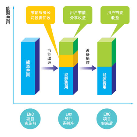 EMC 為客戶提供能源系統(tǒng)診斷、節(jié)能項目可行性分析、節(jié)能項目設(shè)計,幫助項目融資,選擇并采購設(shè)備、安裝調(diào)試、進(jìn)行項目管理、培訓(xùn)操作人員、合同期內(nèi)系統(tǒng)設(shè)備維 護(hù)、節(jié)能量監(jiān)測等一條龍服務(wù),然后與客戶共同驗證項目的節(jié)能效果、環(huán)境效益與經(jīng)濟(jì)效益,最后,與客戶分享項目實施后取得的經(jīng)濟(jì)效益,回收項目的投資和獲得 應(yīng)有的利潤。